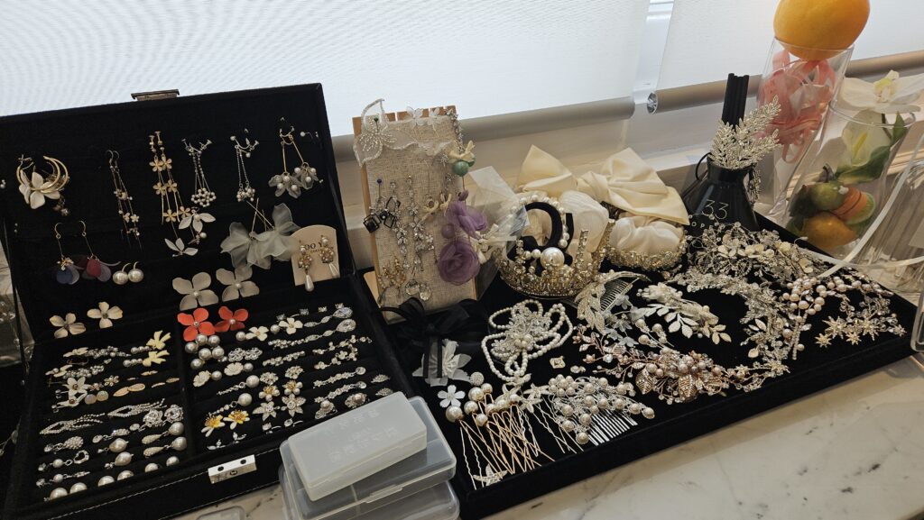 촬영 준비물의 속옥이나 액세서리는 드레스샵에서 챙겨주는 경우가 대부분이긴 하지만 내가 원하는 걸 하려면 개인 소품을 꼭 챙겨야 하죠. 신부는 웨딩슈즈, 보정속옷, 악세사리, 립스틱 등입니다. 촬영 준비물은 신부뿐 아니라 신랑도 꼼꼼히 챙겨야 합니다. 신랑은 넥타이, 구두, 손목시계, 양말까지 체크리스트로 정리해서 준비하면 당일 허둥대지 않아요. 그리고 웨딩 촬영에 자주 등장하는 셀프 소품들(부케, 미니 보드, 장식 등)도 미리 준비해두면 사진이 훨씬 풍성해집니다.